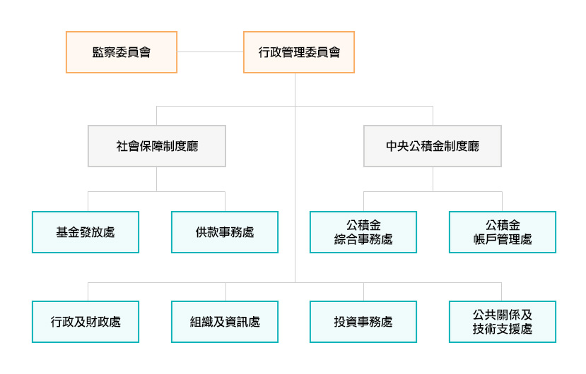 2017年7月18日生效的《社會保障基金的組織及運作》增設一名副主席和一廳四處(包括中央公積金制度廳、公積金綜合事務處、公積金帳戶管理處、投資事務處、公共關係及技術支援處),以有效落實施政目標及履行新增職能。