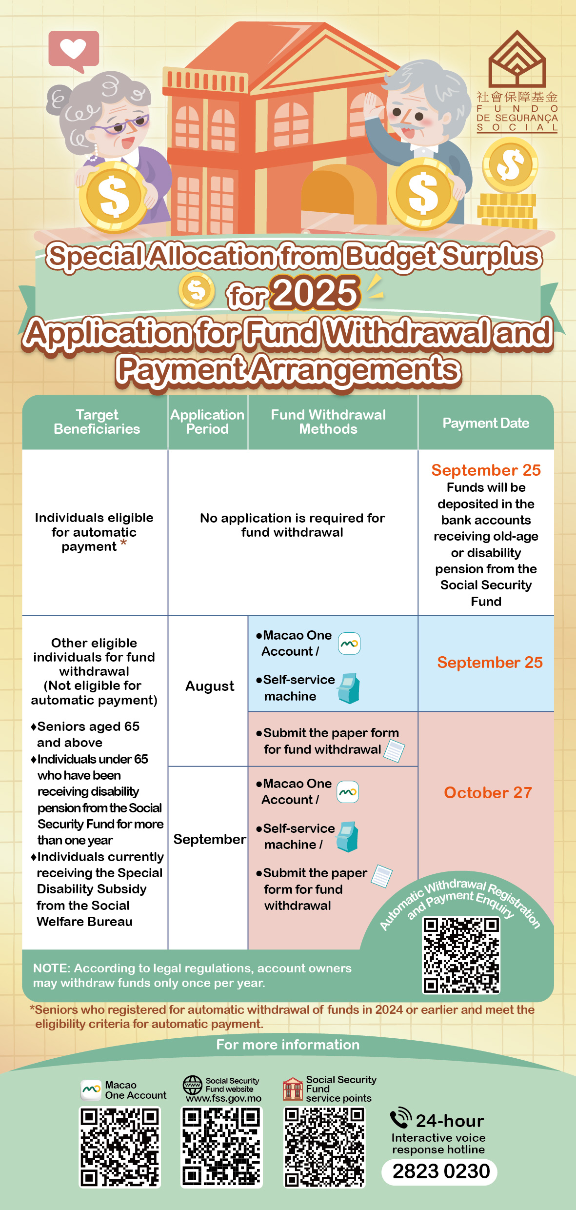 The Social Security Fund reminds residents who have not yet registered for automatic withdrawal that they may do so when submitting their withdrawal application this year. The Social Security Fund also urges the public to stay vigilant against scams and reiterates that it will not send SMS messages containing hyperlinks. For enquiries, please visit the Social Security Fund website at https://www.fss.gov.mo/en/sites/allocation, or call during office hours at 2853 2850.