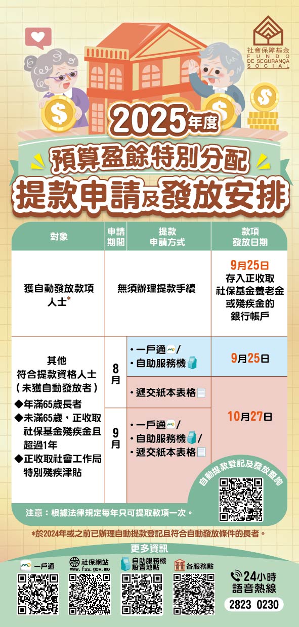已辦理自動提款登記且符合自動發放條件的長者,及於8月內透過“一戶通”或自助服務機辦理提款申請的三類人士(年滿65歲但未獲自動發放、未滿65歲但正收取殘疾金且超過一年、或正收取特別殘疾津貼的人士),獲批的政府管理子帳戶款項於9月25日存入其指定的銀行帳戶。而8月內以紙本方式遞交提款申請或於9月內申請的人士,款項最快於10月27日存入其指定的銀行帳戶。