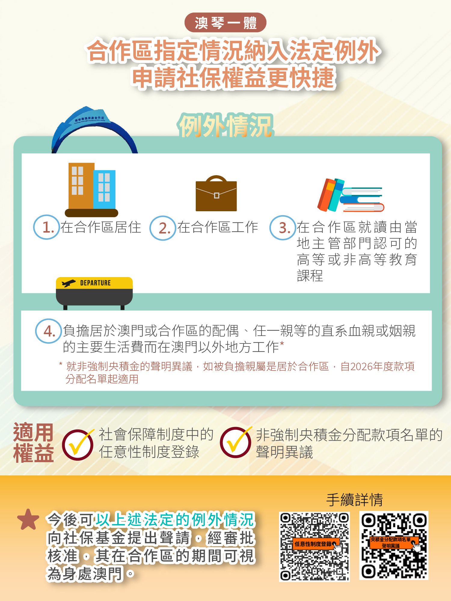 是次修法的重點之一,在於明確將澳門居民身處橫琴粵澳深度合作區(下稱“合作區”)的特定情況,包括將在合作區居住、工作或就讀由當地主管部門認可的高等或非高等教育課程,以及因負擔居於合作區的親屬主要生活費而在澳門以外地方工作等原因,納入法定例外情況,以便在處理上述兩項社保權益時,澳門居民身處合作區的期間可視為身處澳門。